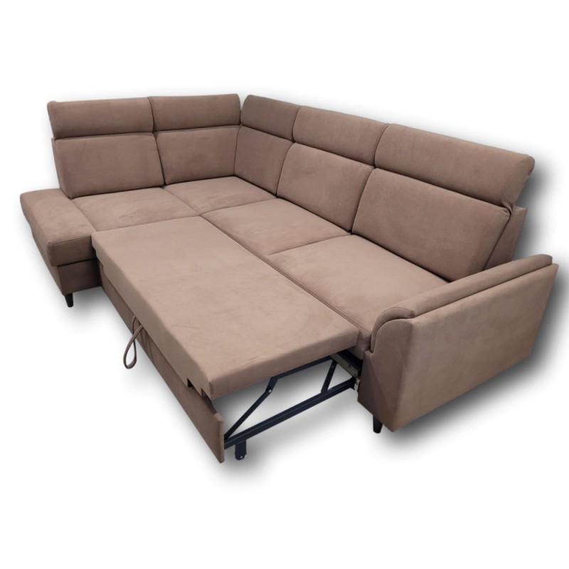 Nowoczesna propozycja w minimalistycznym designie. Wykonany z wysokiej jakości tkaniny to idealna alternatywa dla wielbicieli innowacyjnych projektów. Oferuje maksymalną wygodę podczas odpoczynku, dzięki regulowanym zagłówkom. Narożnik posiada miejsce do spania o wymiarach 200/125 cm oraz pojemnik na pościel. Jego wzór jest prosty, uzupełniony pikowaniami na siedziskach, które podnoszą walory estetyczne wypoczynku i staje się miłym dla oka przedmiotem codziennego użytku.